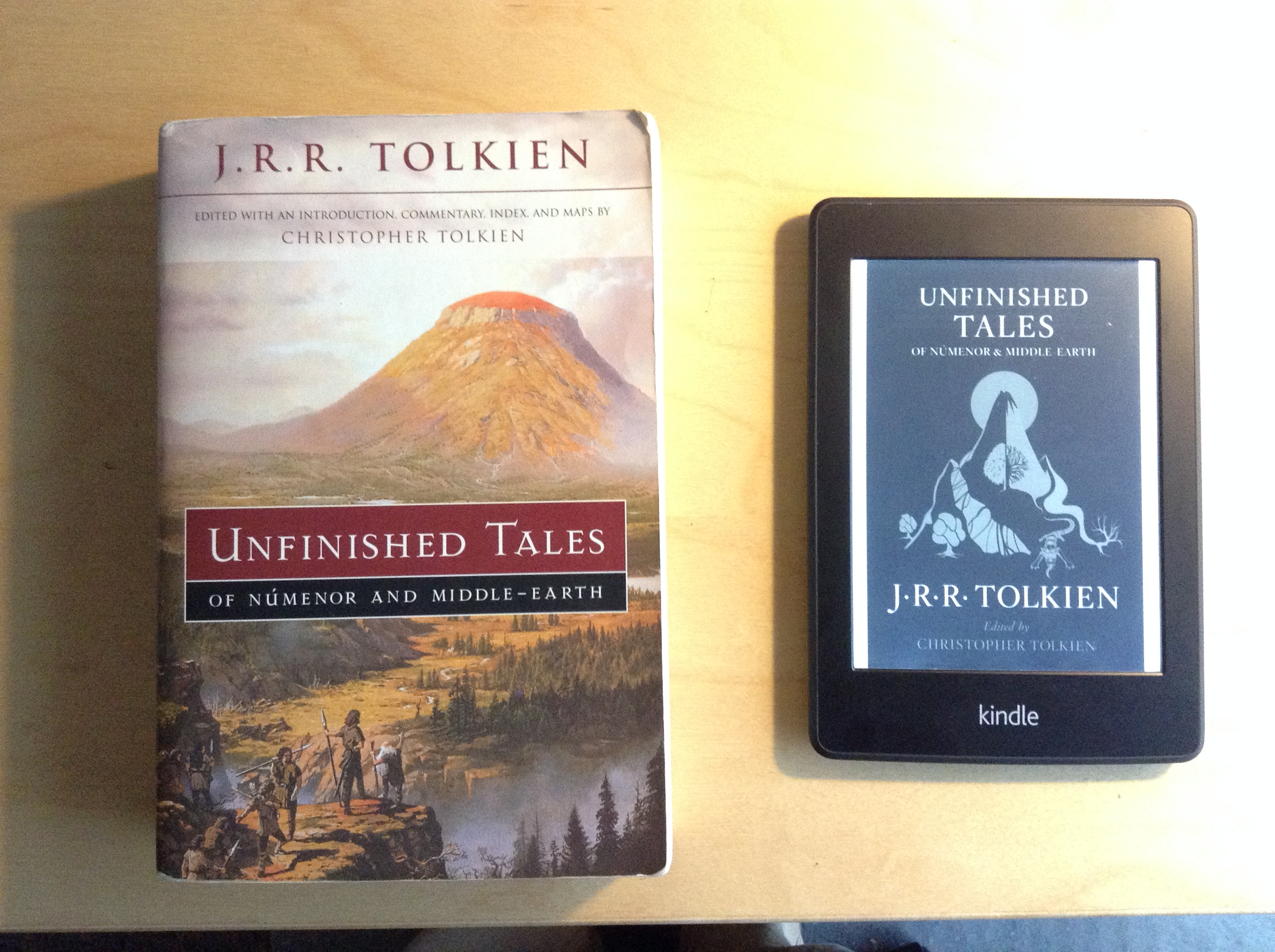 So, the other night, after everything book-wise in my home has been situated – I sat down with a big paperback copy of Unfinished Tales (which is a highly recommended read if you love Tolkien like I do). However, there was something wrong. In all the Christopher Tolkien books, there is a lot of attention paid to the typesetting. Basically the text is so long that it is crammed into tiny blocks, which is not ideal for leisure reading after a long day of staring at a computer monitor. My eyes just couldn’t focus, and my brain couldn’t focus on what I was reading.